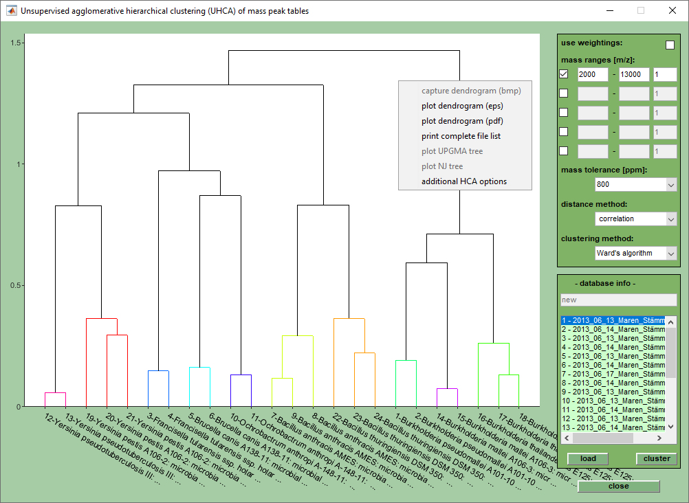 The fusion sequence can be represented as a dendrogram, a tree-like structure which gives a graphical illustration of the similarity of mass spectral fingerprints (see screenshot below). Hierarchical clustering has been extensively used to produce dendrograms which give useful information on the relatedness of the spectra.
