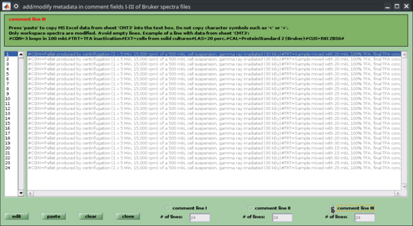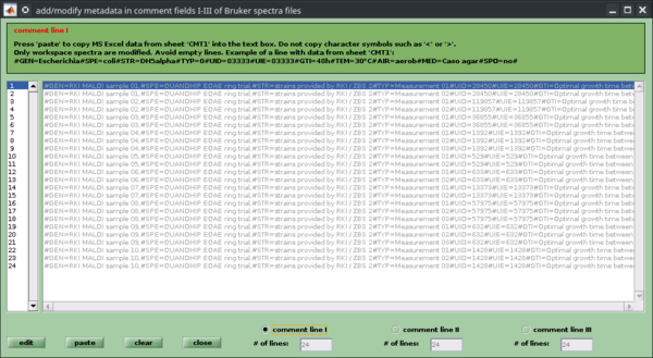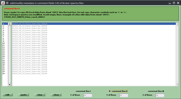 13.Press button edit. MicrobeMS is now comparing the id’s of mass spectra in workspace and the information content of comment line II. In case of identical id’s the data of comment line I and III are added to the original Bruker Daltonics spectral data files (acqu, acqus, pdata/proc and pdata/procs).