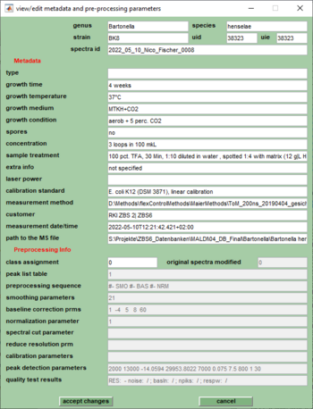 When analyzing MALDI-ToF mass spectra of microorganisms, it is often important to have direct access to taxonomic information, cultivation parameters, sample preparation methods, and other relevant data associated with the acquisition of mass spectra in the context of microbiology. Historically, MALDI-ToF mass spectrometry was developed by physicists for physicists and chemists in the late 1980s and early 1990s. At that time, it was difficult for the developers to imagine that MALDI-ToF MS could be relevant to the classification and identification of microorganisms. As a result, most of the MS data formats developed in those years (and often still used today in almost unchanged form) do not provide any way to store additional microbiological (non-spectrometric) metadata.